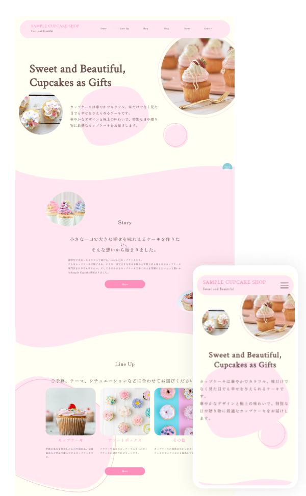 曲線を多用した柔らかく親しみやすい印象を与えるデザインになるため、スイーツ販売以外にも女性をターゲットとしたサロン系や情報サイトなどに適したテンプレートになります。